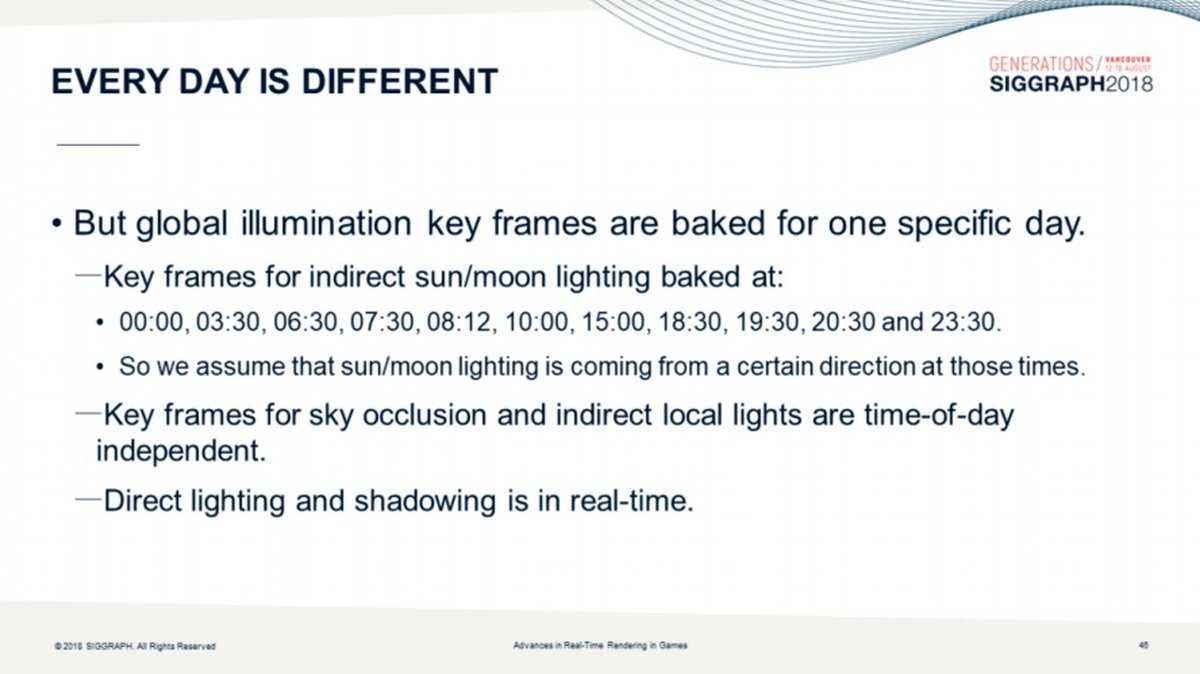 В частности, новая система сильно усложняла реализацию глобального освещения. Раньше разработчики заранее рассчитывали одиннадцать ключевых точек глобального освещения, привязанных ко времени, а игра плавно меняла освещение от точки к точке.