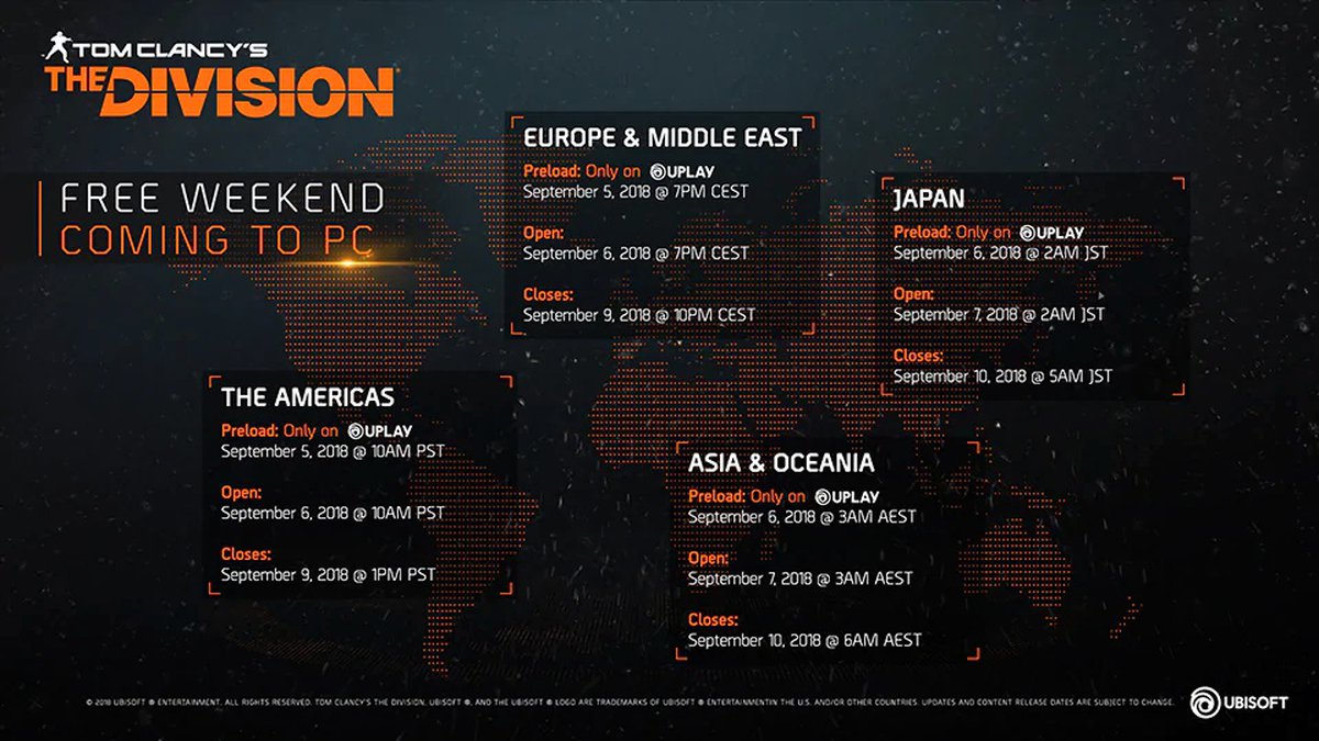 Разработчики не пояснили, какой контент будет доступен участникам бесплатных выходных. Во время предыдущего события игроки могли без ограничений проходить базовую версию The Division и все три дополнения: «Под землей», «Выживание» и «Последний рубеж».