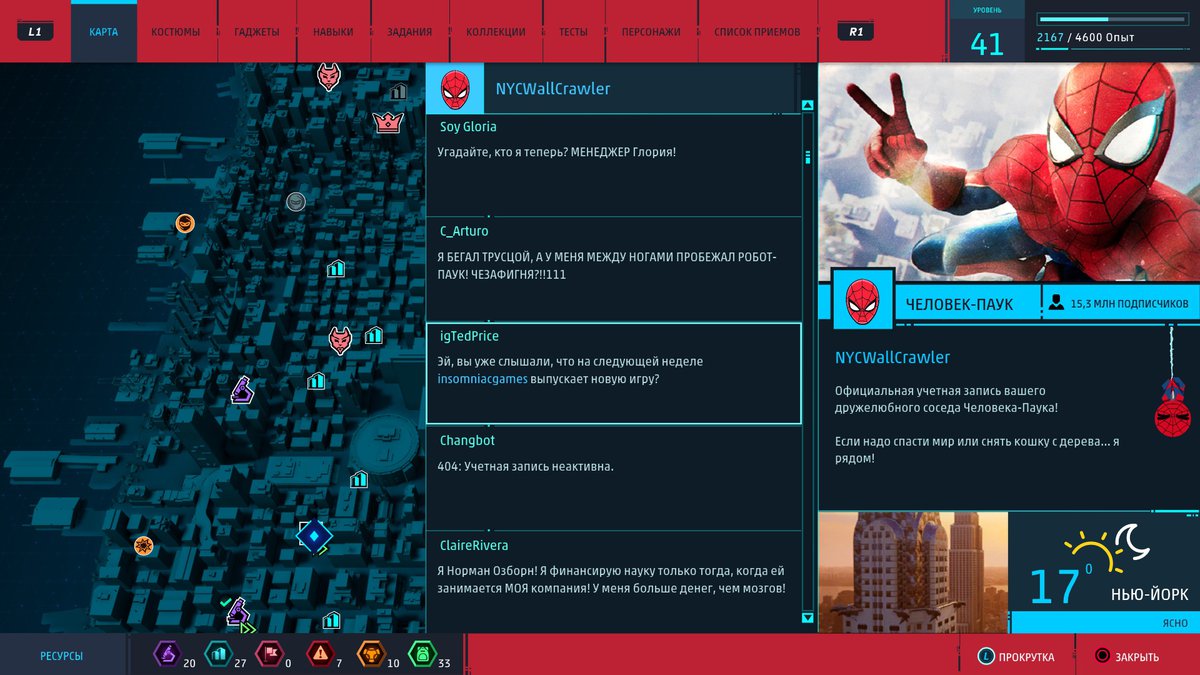 В новом Spider-Man Питер Паркер ведет твиттер-аккаунт NYCWallCrawler: на экране карты собираются сообщения многочисленных фанатов и противников Человека-паука. Среди комментариев о драках со злодеями и экранах Таймс-Сквер, отремонтированных с помощью паутины, встречаются незаметные пасхалки.