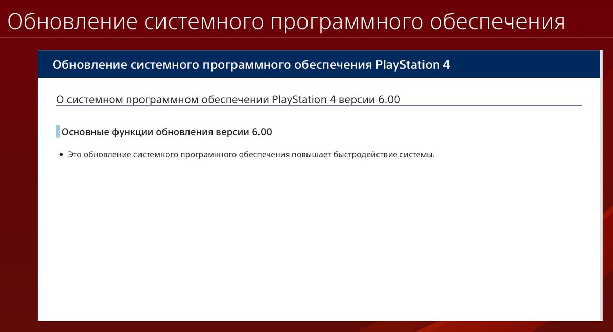 Пакет обновлений с прошивкой 6.00 весит чуть больше 400 мегабайт. Хотя Sony присвоила прошивке следующую мажорную версию, список изменений у обновления лаконичный: обновление до версии 6.00 «повышает быстродействие системы».
