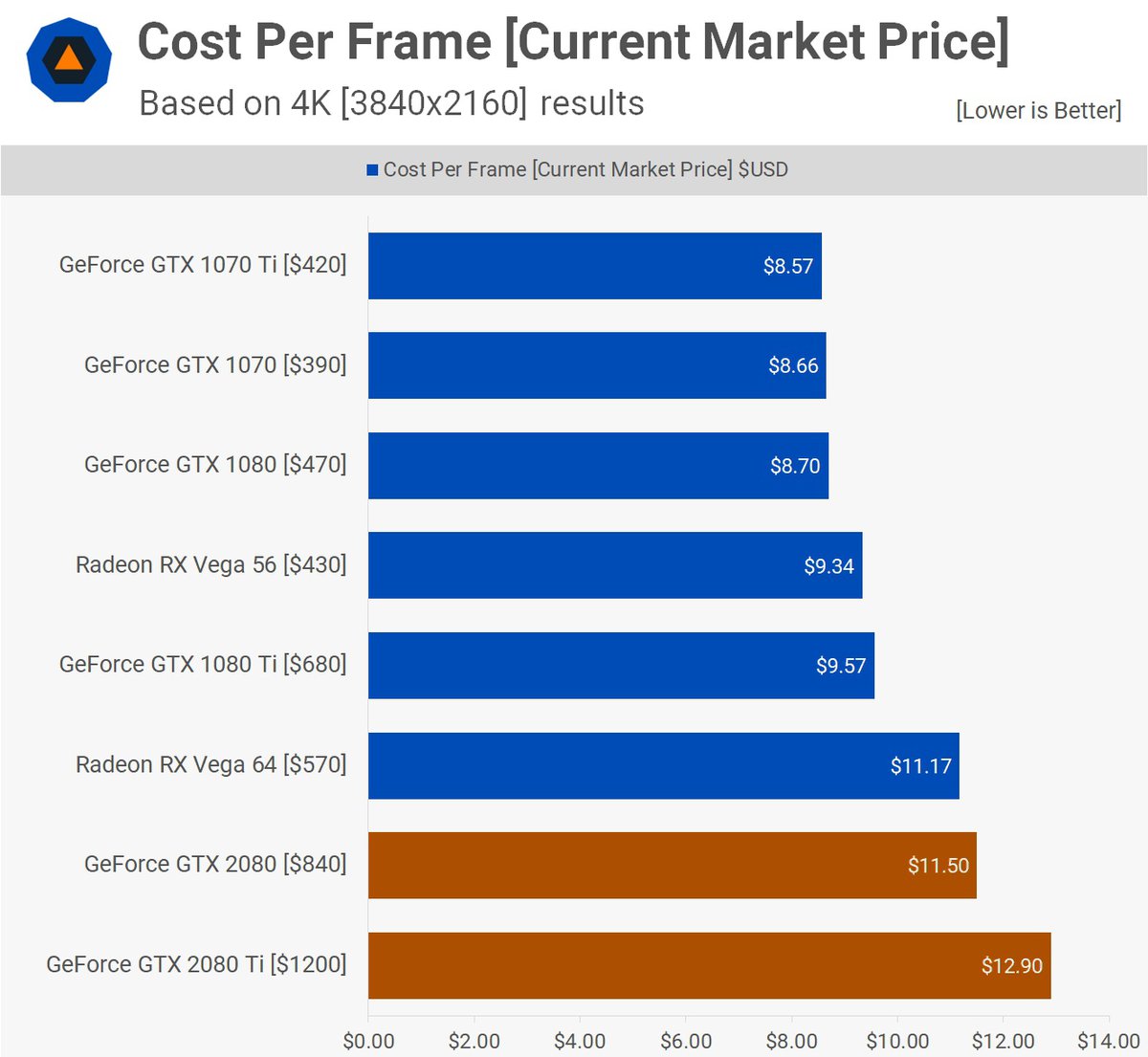 Интересно, что в разрешении 4К GeForce RTX 2080 и RTX 2080 Ti возглавили антирейтинги соотношения fps к стоимости видеокарты. Самыми выгодными картами в этом отношении пока остаются GeForce GTX 1070, GTX 1070 Ti и Radeon RX Vega 56; правда, на 60 кадров в секунду их владельцам рассчитывать не стоит.