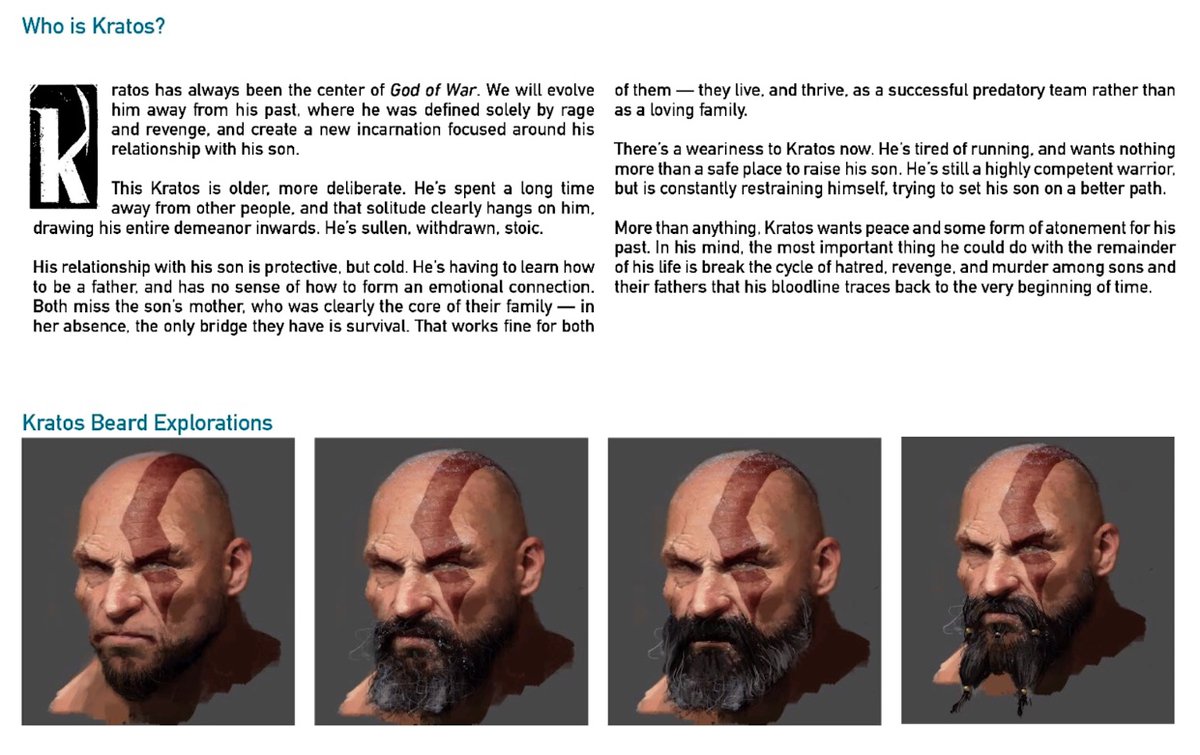 Борода Кратоса, как оказалось, пережила несколько итераций: вместо финального варианта герой мог получить легкую небритость, не такие волосатые щеки или бороду и усы, заплетенные в несколько косичек. В конце концов было решено использовать более простой вариант с клиновидной бородой.