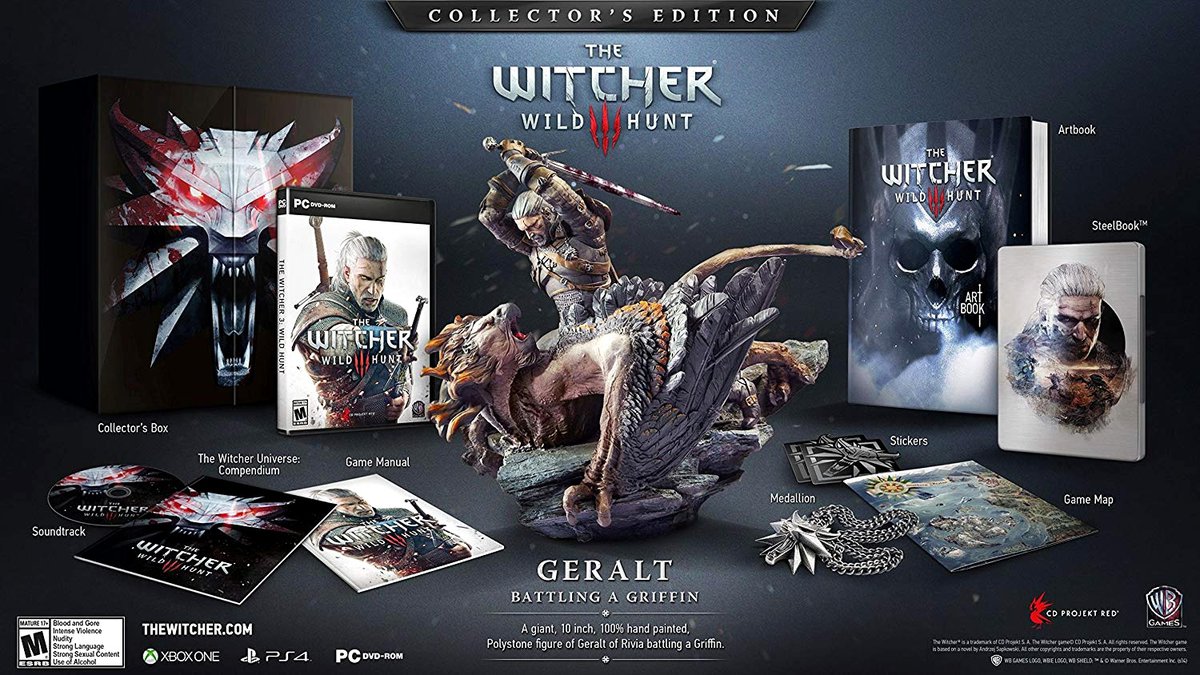 У него есть Diablo 3 (с артбуком, черепом Дьябло и кучей бонусов), Diablo 3 Reaper of Souls (на этот раз только с артбуком), The Witcher 3 Wild Hunt (та самая коллекционка со статуэткой Геральта и грифона), а также специальные издания обоих дополнений для The Witcher 3 с картами для Гвинта.
