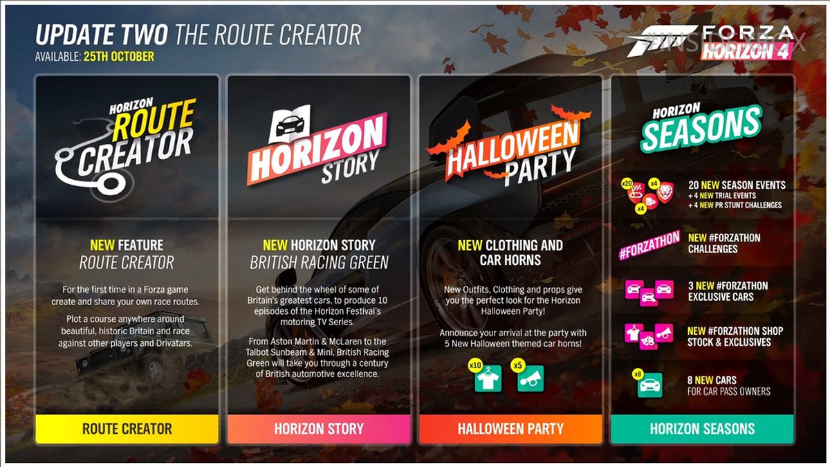Первое пострелизное обновление для игры выйдет 25 октября. Оно введет в Forza Horizon 4 новую историю, состоящую из десяти эпизодов, а также добавит два десятка сезонных событий, новые испытания, три эксклюзивных автомобиля и восемь машин для владельцев Car Pass.