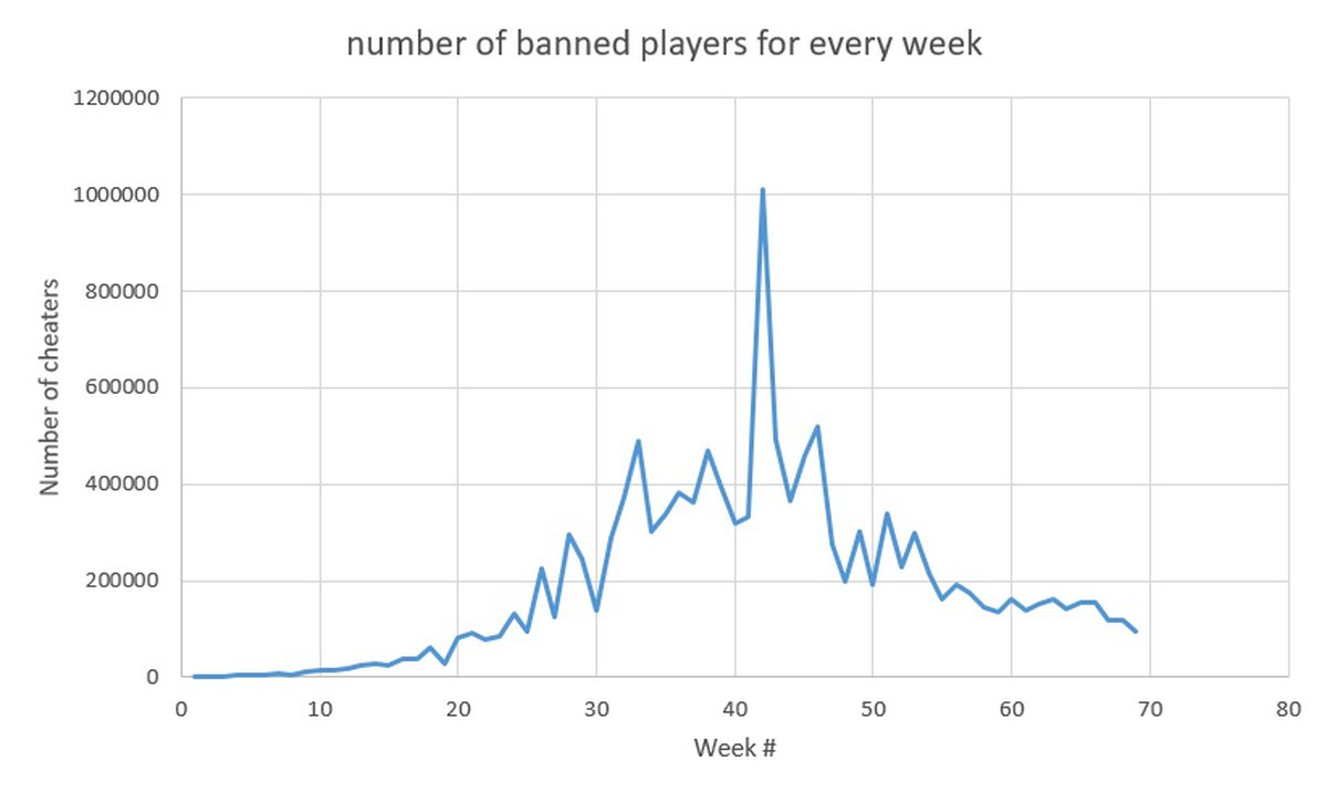 На основе собранных данных sjk045 построил график, показывающий число блокировок по неделям. Хорошо видно, что в последнее время количество банов идет на спад; возможно, это связано с уменьшением аудитории PUBG.