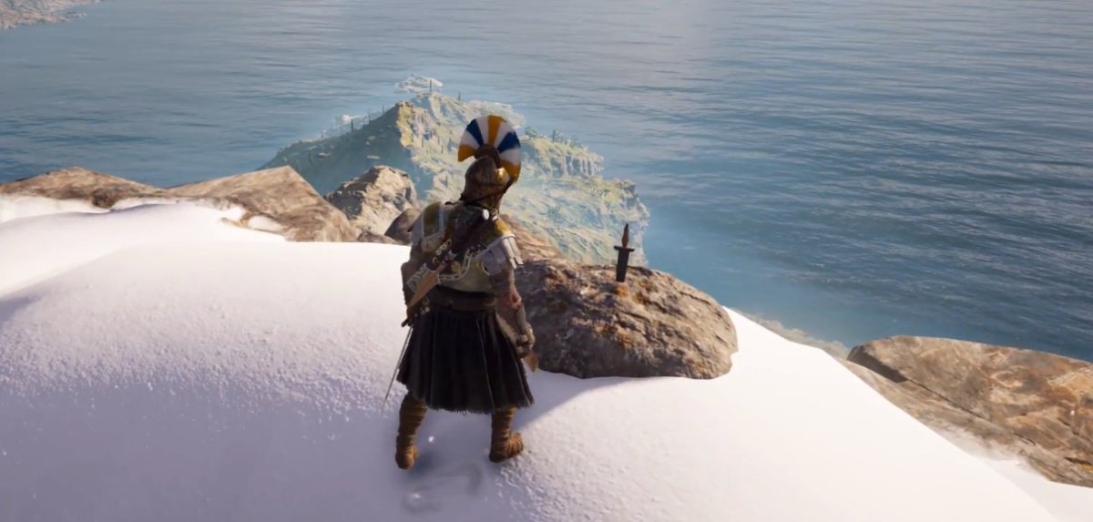 На вершине одной из греческих гор создана необычная инсталляция: в скалу здесь воткнут клинок. Вероятно, это отсылка к королю Артуру и его первым мечом: Артур достал его из камня, доказав право на трон. Кстати, в игре достать меч нельзя.