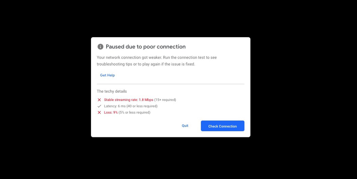 В случае критического ухудшения качества связи Project Stream расскажет, что именно пошло не так, и предложит провести тестирование канала. Мы не знаем, что происходит с игрой во время вынужденного перерыва; возможно, она ставится на паузу.