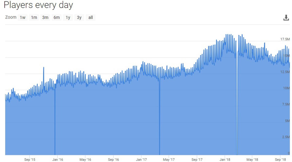 В то же время число одновременно активных игроков в Steam почти не меняется. Например, 11 октября 2017 года пиковый онлайн составлял 13.8 миллиона игроков; 11 октября 2018 года в Steam одновременно находилось максимум 13.4 миллиона игроков.