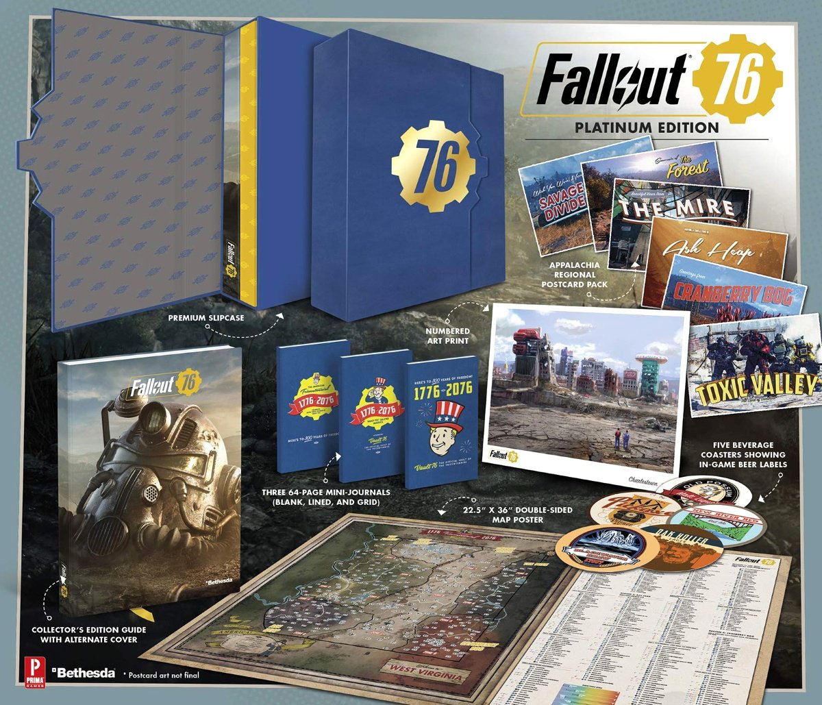 Сегодня Bethesda открыла прием предзаказов на Fallout 76 Platinum Edition, одно из самых дорогих изданий игры. За $115 покупатели получат три записных книжки в стиле Fallout 76, огромную карту игрового мира, набор открыток Аппалачии, руководство по прохождению (плюс его цифровую версию), особый кейс и еще несколько бонусов.