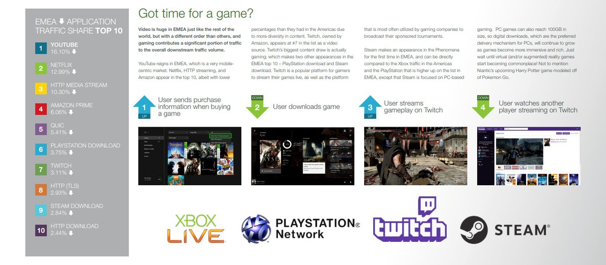 Интересно, что PlayStation нет в десятке самых трафикогенерирующих сервисов Америки, зато на девятом месте есть Xbox Live c 2.09% трафика. В регионе EMEA, напротив, нет сервиса Microsoft: PlayStation здесь генерирует 3.75% трафика, Steam — 2.84% трафика.