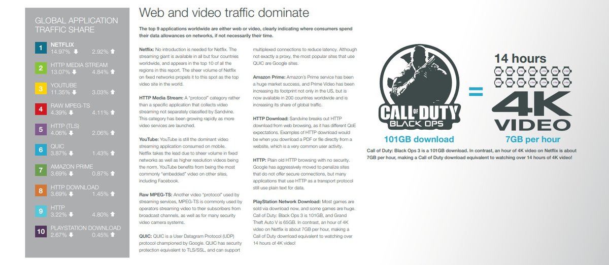 Первое место по объему занимает стриминговый сервис Netflix (на его долю приходится 15% трафика), третье (11.4% трафика) удерживает YouTube. По данным Sandvine, Netflix пользуется наибольшей популярностью в обеих Америках, а YouTube на первом месте в регионе EMEA (Европа, Африка и Ближний Восток).