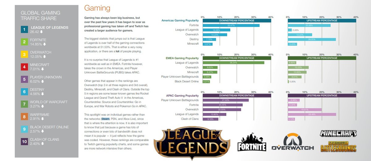 Отчет Sandvine позволяет отследить популярность игр по регионам. В обеих Америках очень активно играют в Fortnite, League of Legends и Overwatch. Жители региона EMEA предпочитают League Legends (она лидирует с гигантским отрывом), затем идут Overwatch и Minecraft.