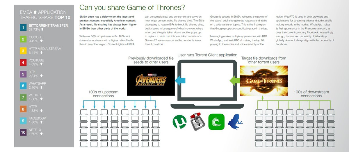Самым популярным протоколом для раздачи трафика оказался BitTorrent. В Америке на него приходится 9.21% всего исходящего трафика, в регионе EMEA доля BitTorrent увеличивается до 31.73%, в регионе APAC она составляет 19.11%.