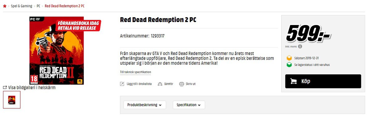 В качестве даты выхода указано 31 декабря 2019 года (очевидная заглушка), MediaMarkt предлагает предзаказать Red Dead Redemption 2 2 на PC за 599 крон, или около 4300 рублей. Владельцам PC в Швеции живется не так сладко, как у нас.