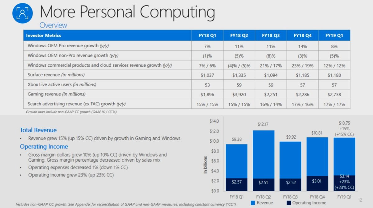 Направление More Personal Computing, в которое входит операционная система Windows и игровое подразделение, показало рост на 15%.