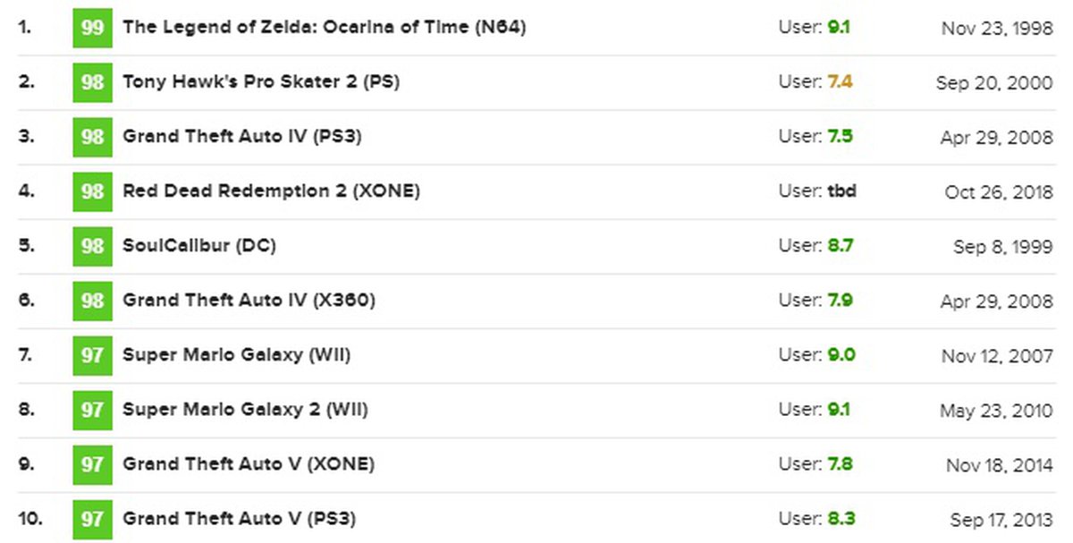 В данный момент Red Dead Redemption 2 (речь идет о версии для Xbox One) удерживает четвертую строчку в топе Metacritic, причем более высоким рейтингом может похвастать только одна игра — вышедшая в 1998 году The Legend of Zelda Ocarina of Time. У остальных конкурентов RDR 2 тоже по 98 баллов из 100.