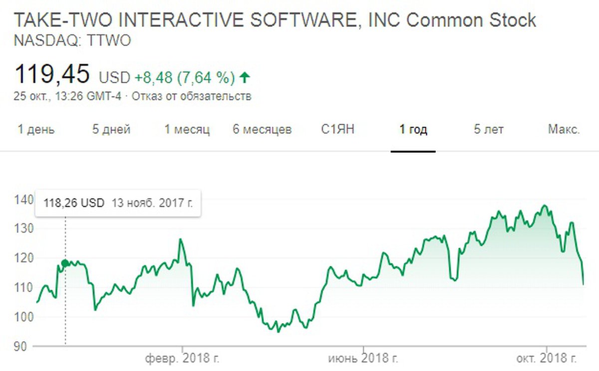 Само падение, впрочем, началось раньше, в конце сентября. Только за три с половиной недели октября акции Take-Two Interactive потеряли около 20% стоимости, сейчас компания стоит примерно столько же, сколько и в середине ноября 2017 года.