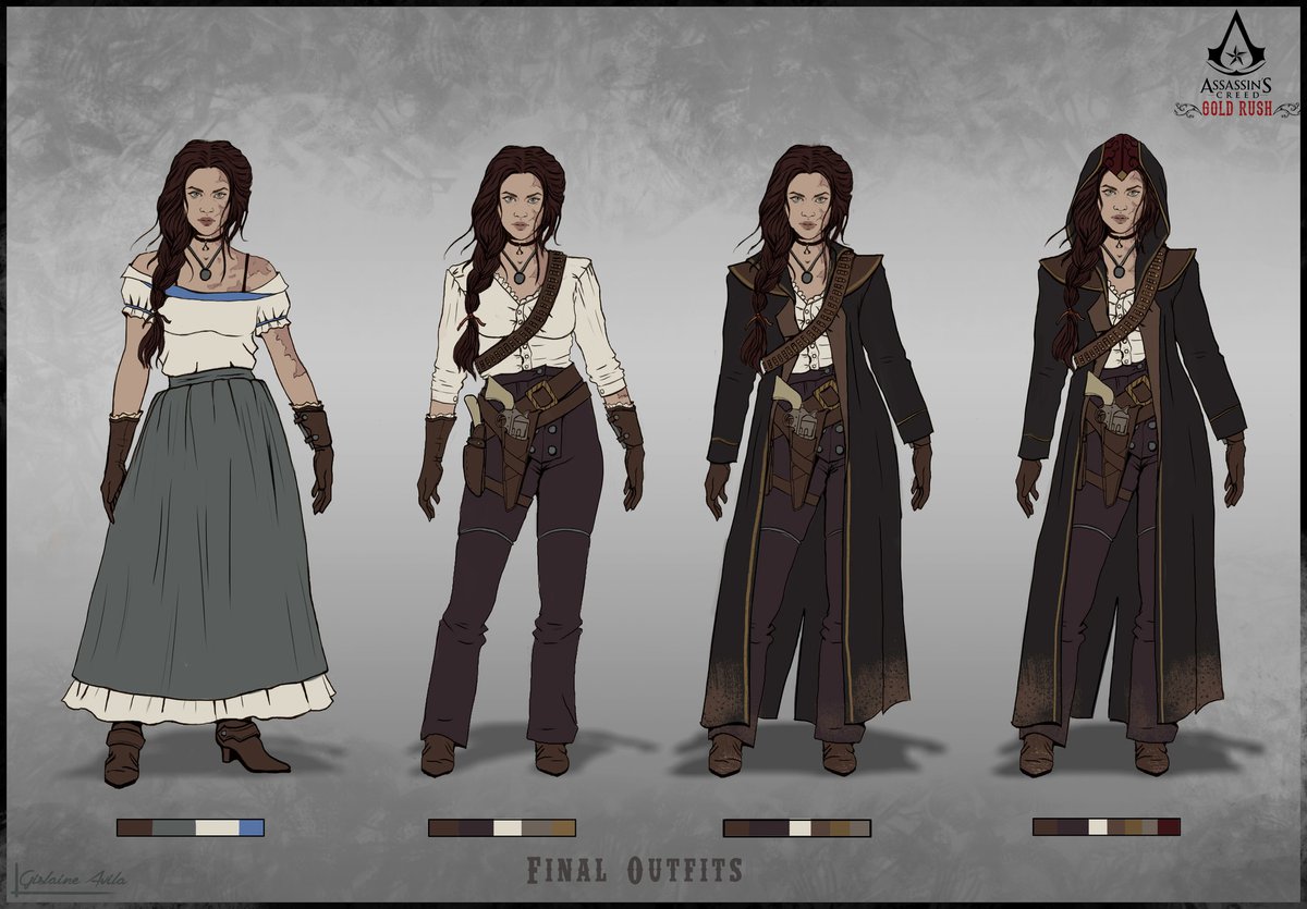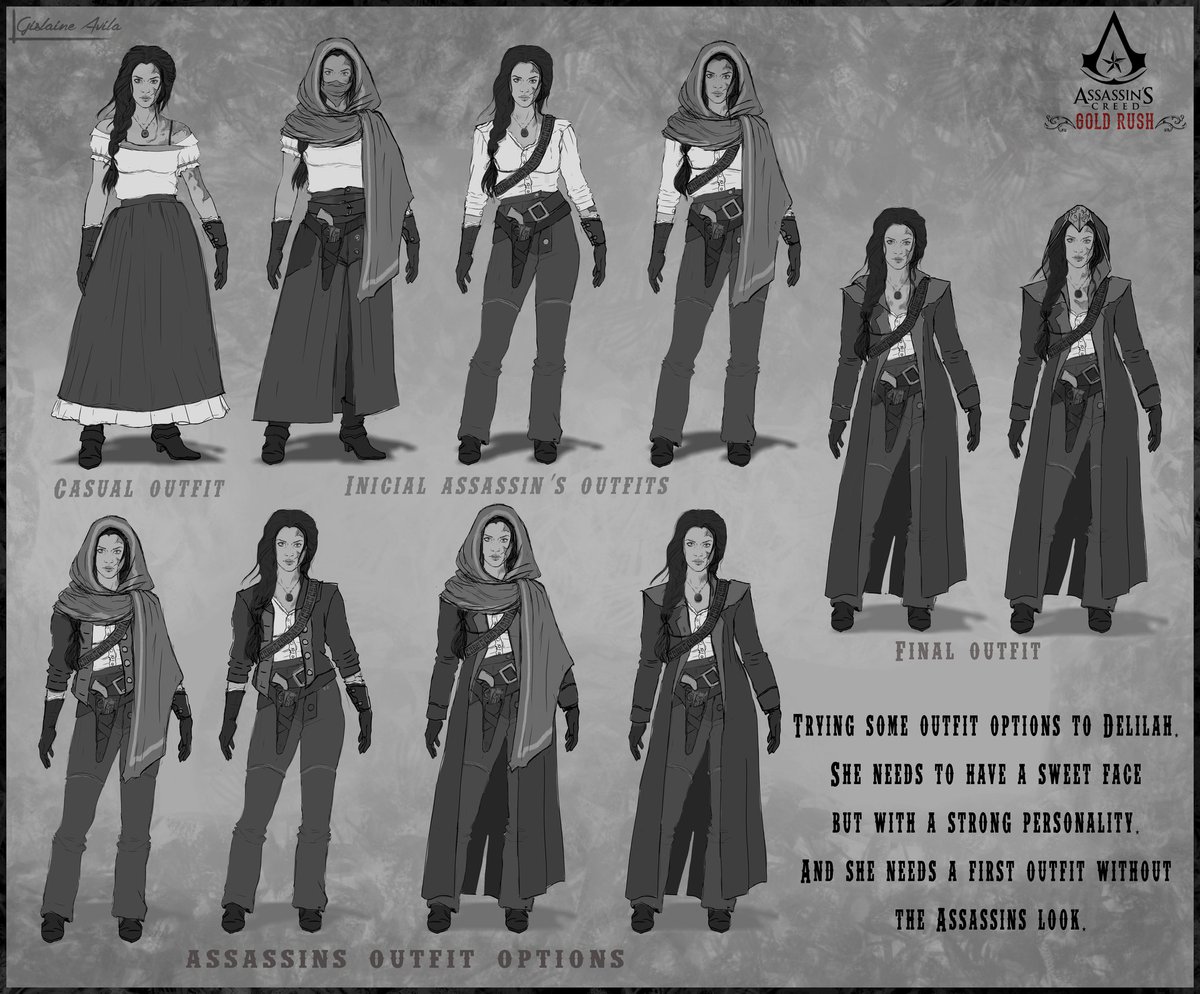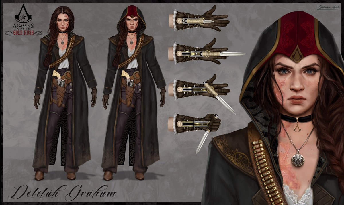 Свое видение ассасинской золотой лихорадки Авила опубликовала на ArtStation. Жислен придумала Делайлу Грэхем, 22-летнюю девушку из богатой техасской семьи. Как-то раз на поместье Грэхемов напал Ирландец: его прихвостни, Стервятники, убили Лили, маленькую сестру Делайлы, и ее отца.