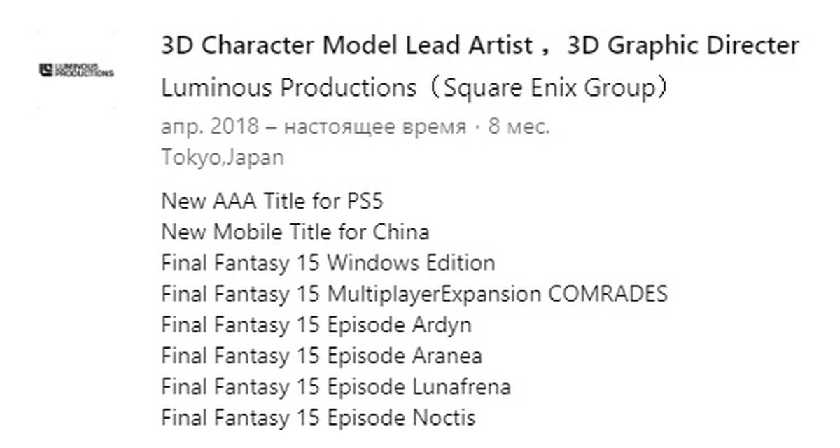 Компания Luminous Productions, внутренняя студия Square Enix, разработавшая Final Fantasy XV и сейчас занимающаяся несколькими новыми проектами, может работать над игрой для следующего поколения PlayStation. В резюме ведущего художника по персонажам Томохиро Токоро прямо упоминается участие в проекте для PlayStation 5.