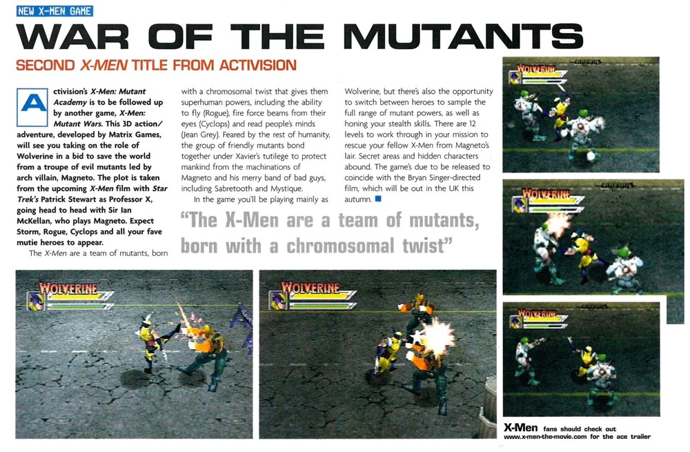 Разрабатывалась студией Matrix Games, игра разрабатывалась для PlayStation. Исходя из статьи в журналах, события игры копировали сюжет предстоящего первого фильма. Главным героем являлся Росомаха, который должен был спасти мир от мутантов, во главе которых стоял Магнето. Указывается, что в игру могли добавить: Шторм, Роуг, Циклопа и других. Сообщается, что помимо Логана, переключаться можно было между 12-тью героями, но какими именно – неизвестно. Игра должна была выйти одновременно с фильмом 2000 года.