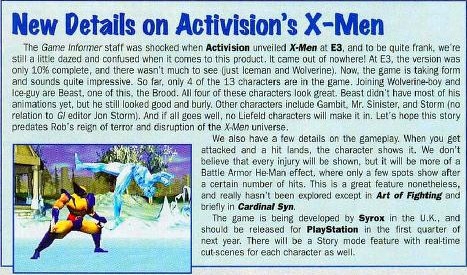 Изначально, игру разрабатывала Syrox, но была отменена из-за того, что её нельзя было подать как игру приуроченную к первому полнометражному фильму. Разработку свернули и проект передали студии Paradox Development, которая, в конечном итоге, создала трёхмерный файтинг по вселенной Людей Икс на PlayStation – X-Men: Mutant Academy.