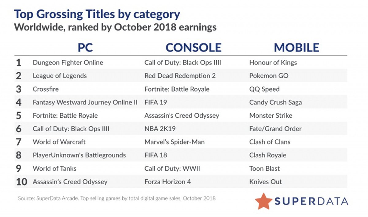 Аналитики SuperData Research рассказали о состоянии цифрового рынка игр в октябре 2018 года. Только консольные игры сгенерировали выручку в $1.53 миллиарда — это на 80% больше, чем в октябре 2017 года. Непосредственно на покупку игр было потрачено больше $1 миллиарда, это первый месяц с таким показателем в истории наблюдений.