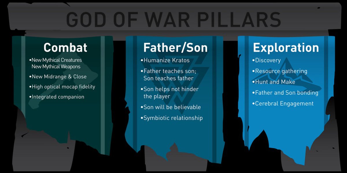 Разработчики решили построить новый God of War на трех столпах: сражения, отношения отца и сына и исследование открытого мира. ДиМенто присоединился к команде игры в 2015 году, тогда наименее проработанной была часть, касающаяся исследования.