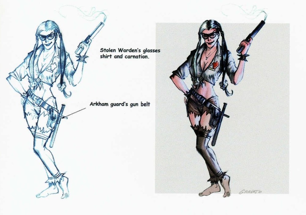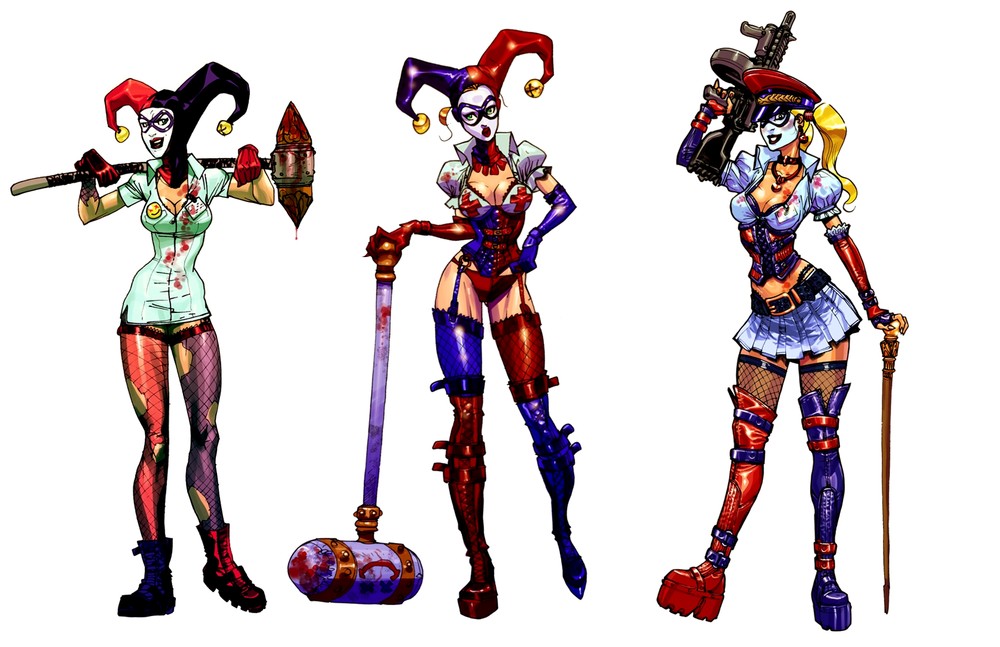 Зато остальные костюмы заставляют шишку становиться твёрдой. Отталкиваться они начали от униформы врача, собственно, она и сохранилась даже на финальном этапе. Добавили раскраску лица, но зачем-то перенесли голову из оригинального костюма, появившегося в Animated Series. Разорванные и крайне откровенные чулки были окрашены в цвет её головного убора. А на вооружение она взяла топор, судя по крови, она уже провела кому-то срочную операцию по удалению жизни.