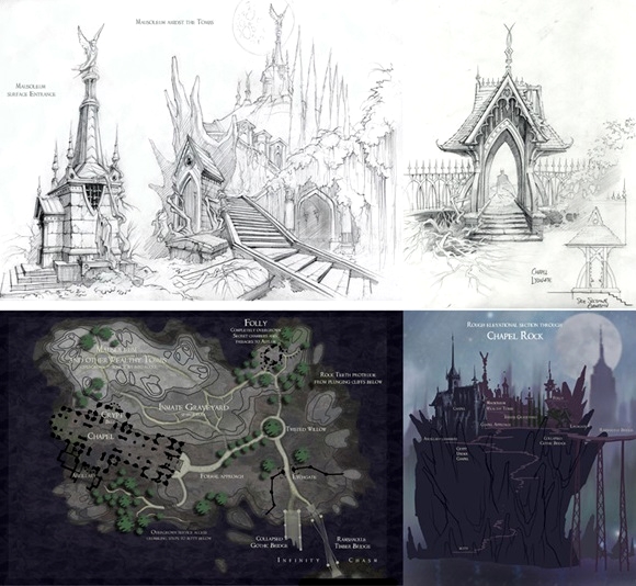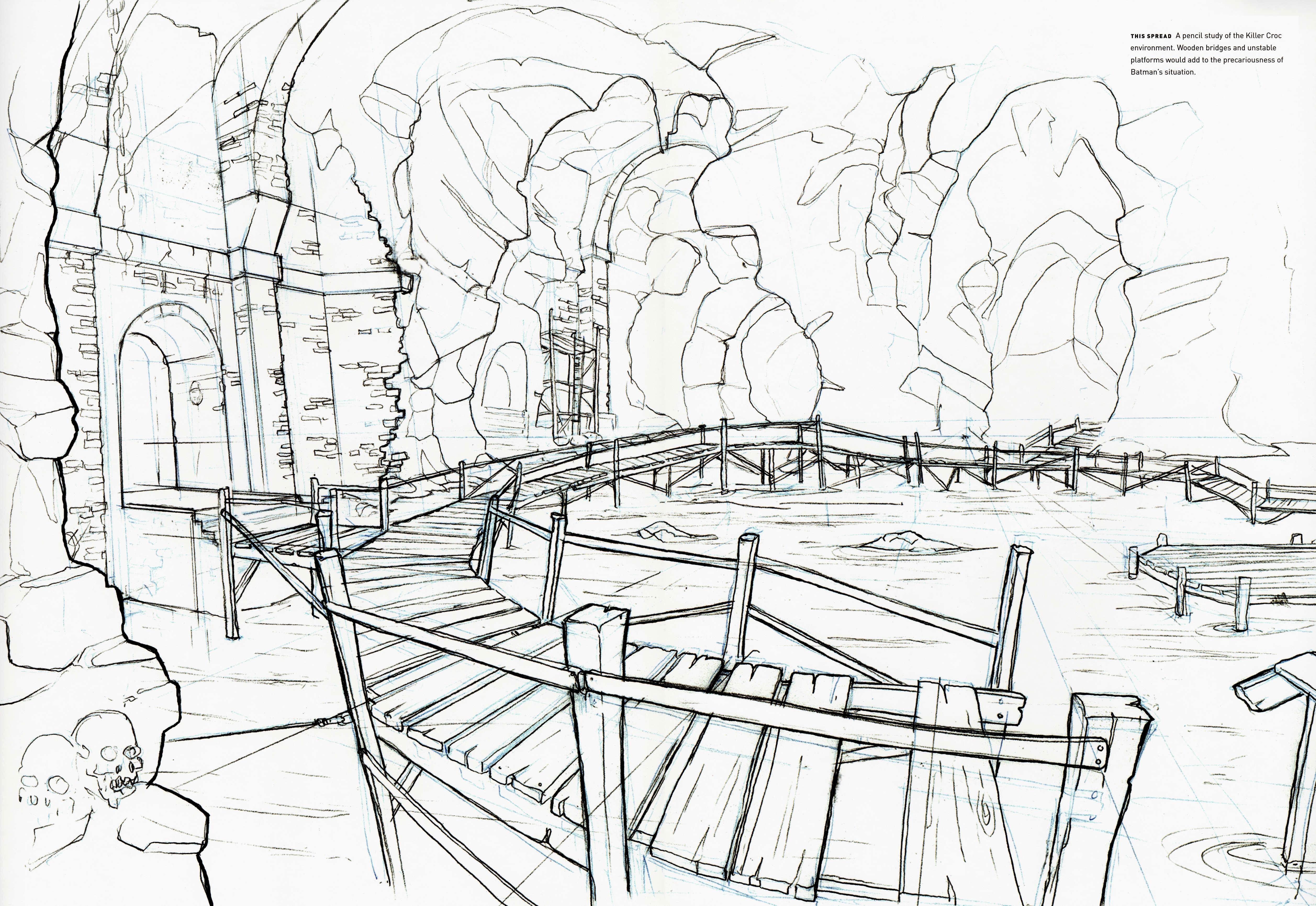 Канализация, где живут туфли Джокера, Крок. Изначально была круговая, т. е. находить споры Ядовитого Плюща было проще, а от Крока бежать приходилось кругами. Нельзя сказать наверняка, что лучше и точно ли изображена вся локация. Это лишь концепты.