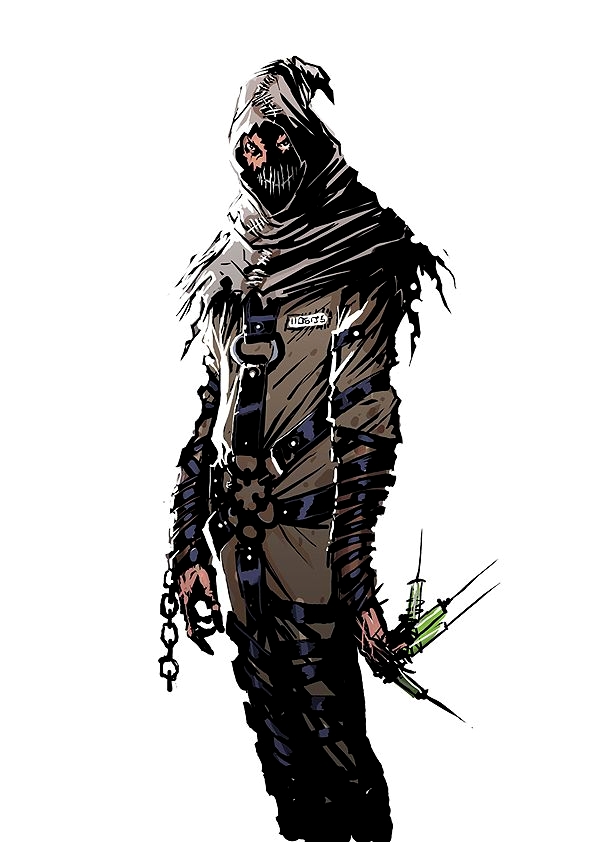 Тут всё тухло, изначально был окутан в цельную одежду, затем всё разорвал и добавил на руки больше колб с токсином.