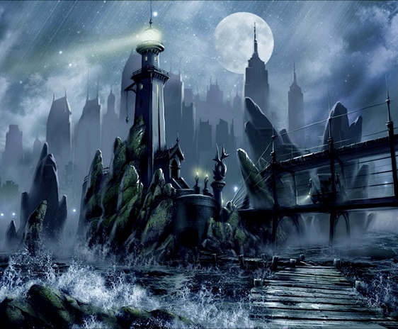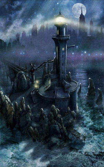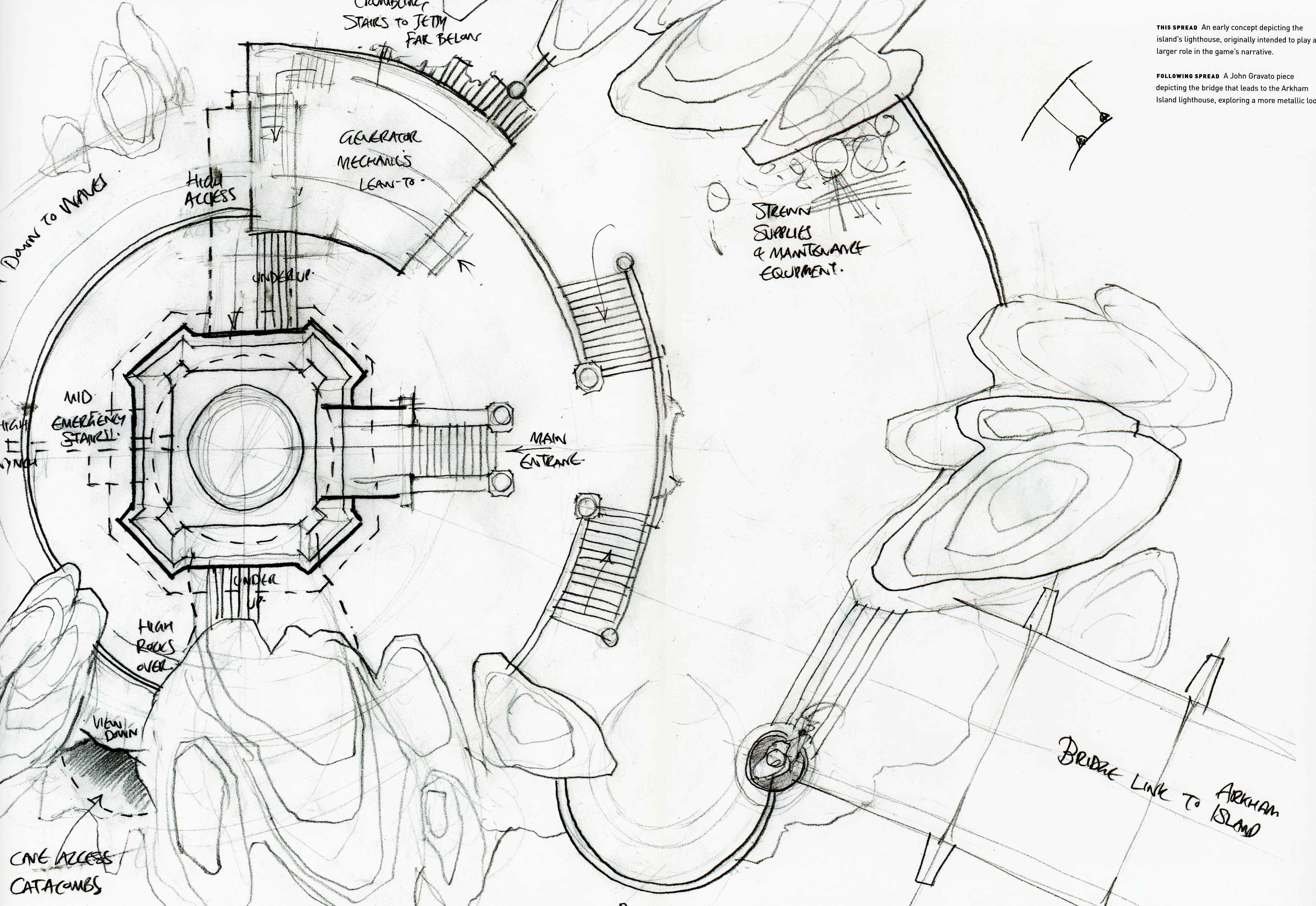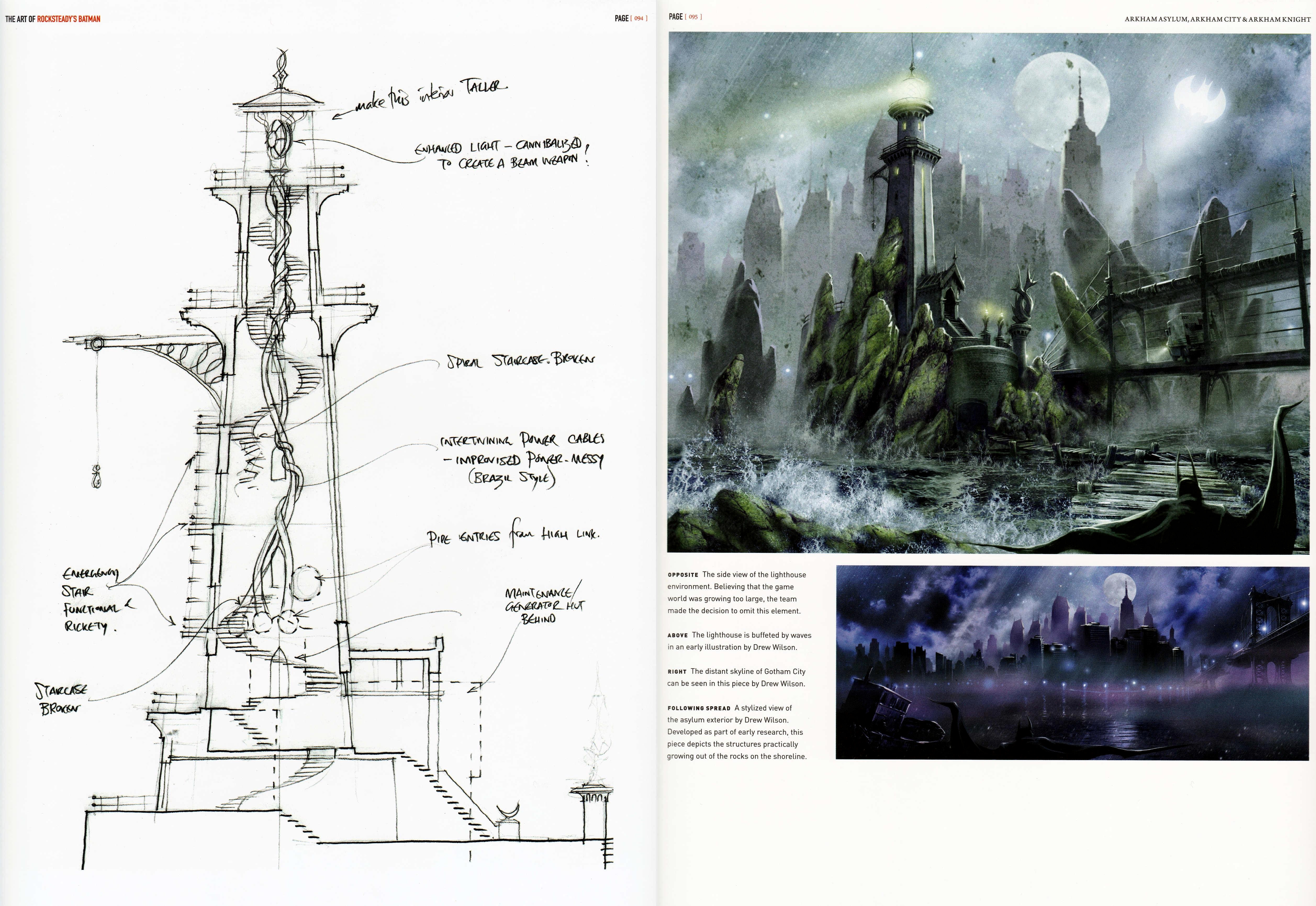 Лечебница имени Аркхем, Амадэй постарался на славу, правда, построили её не так, как задумывалось, а совершенно иначе. Из-за ненужности вырезали целый маяк, а пристань оставили. В маяке даже можно было ходить! Находился он на отдельном мини-островке, проход на который осуществлялся через мост. Сам же маяк, из зарисовок, менялся не один раз.