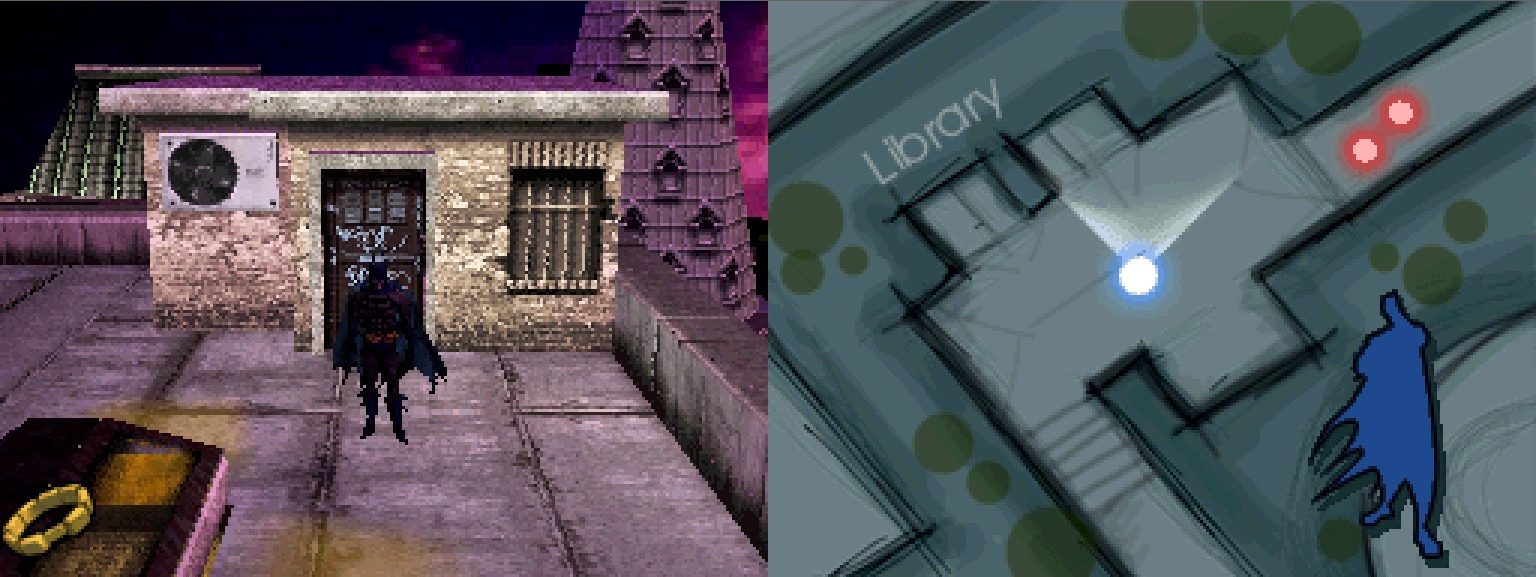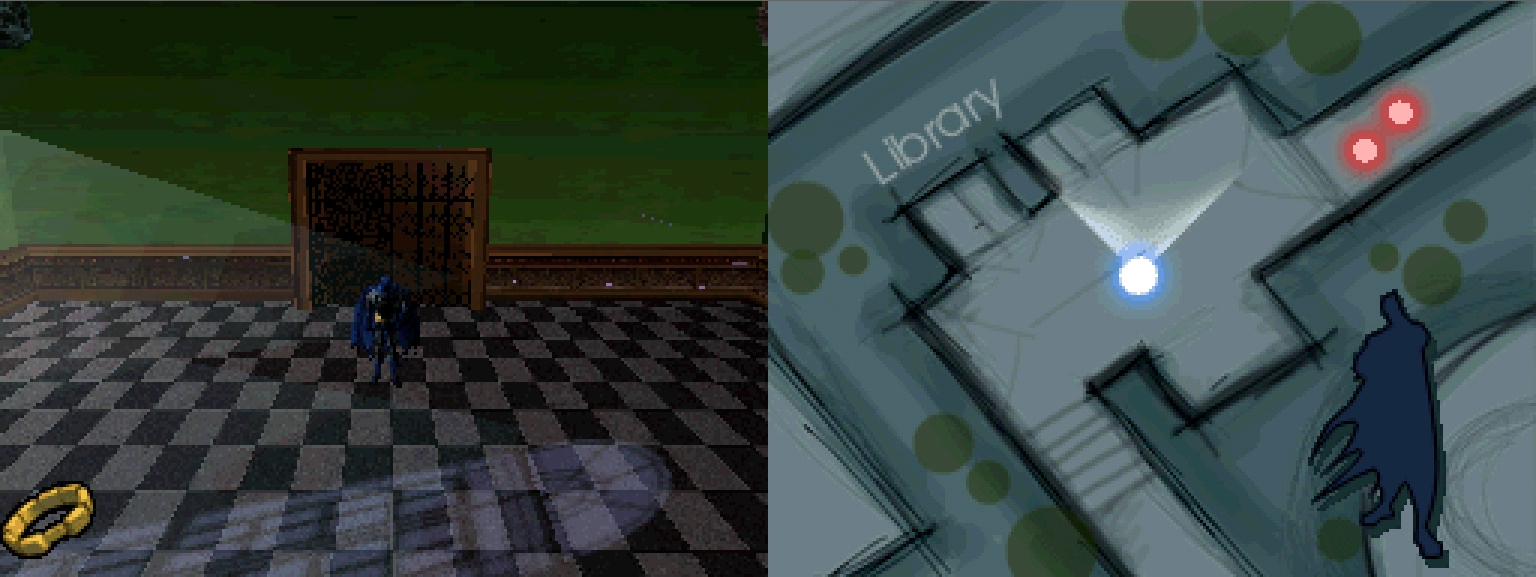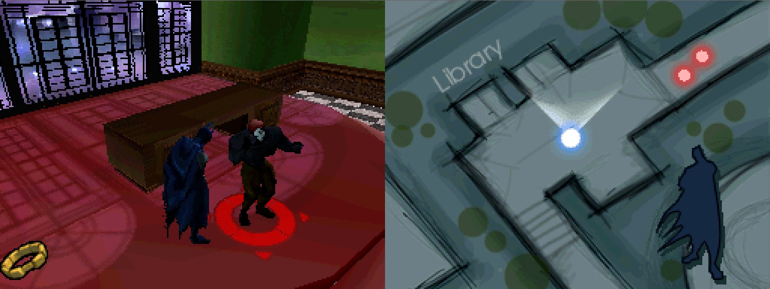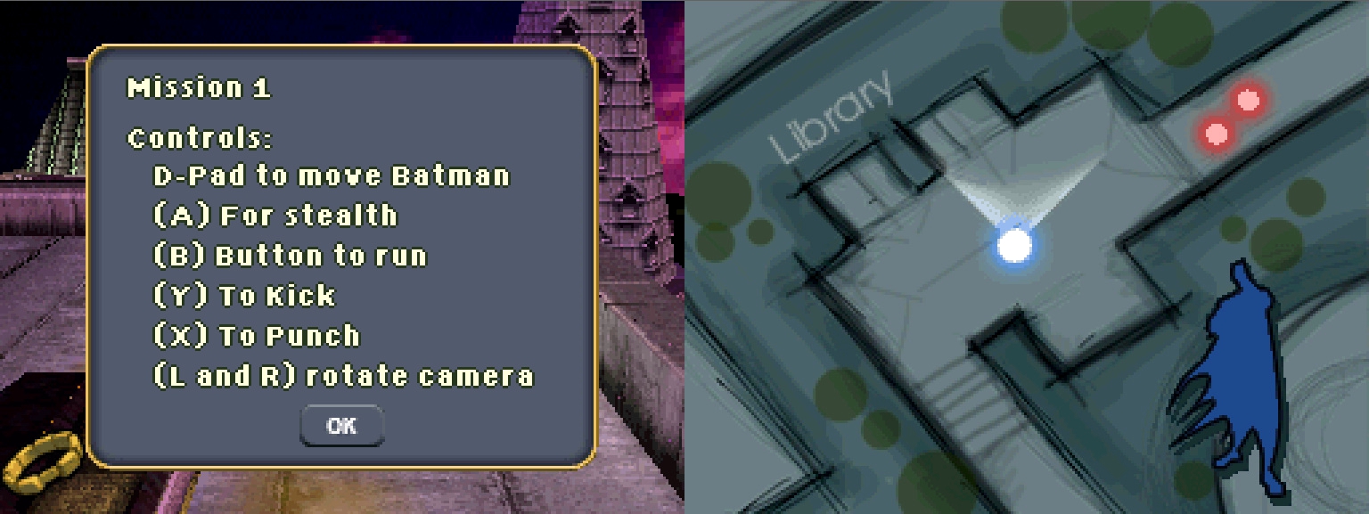 Для пробы доступны два уровня: крыша и библиотека. Мини-карта не работает, это просто картинка. Бэтмен может драться руками и ногами, а также есть отдельная кнопка для бесшумной ходьбы. К сожалению, враги ходить не могут, как и атаковать. Бэтмен умереть не может, хоть и полоса жизни, в виде силуэта героя, опускается до нуля.