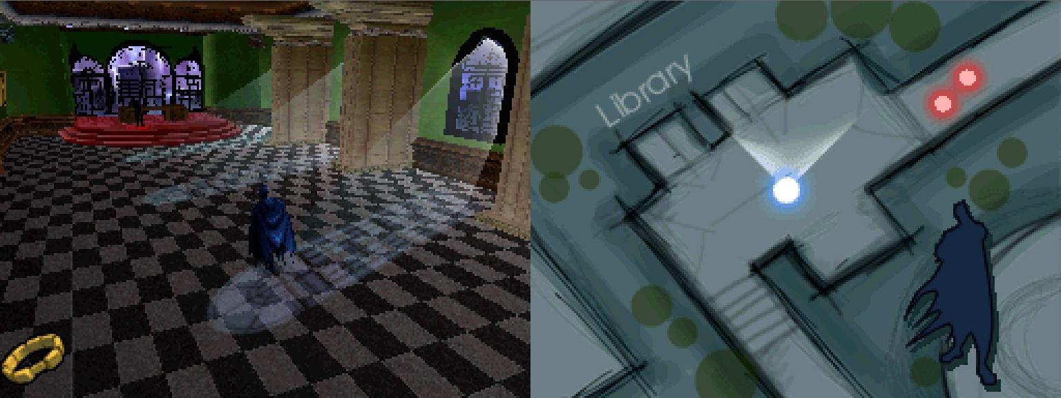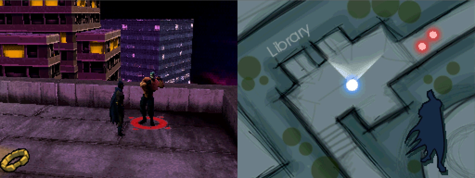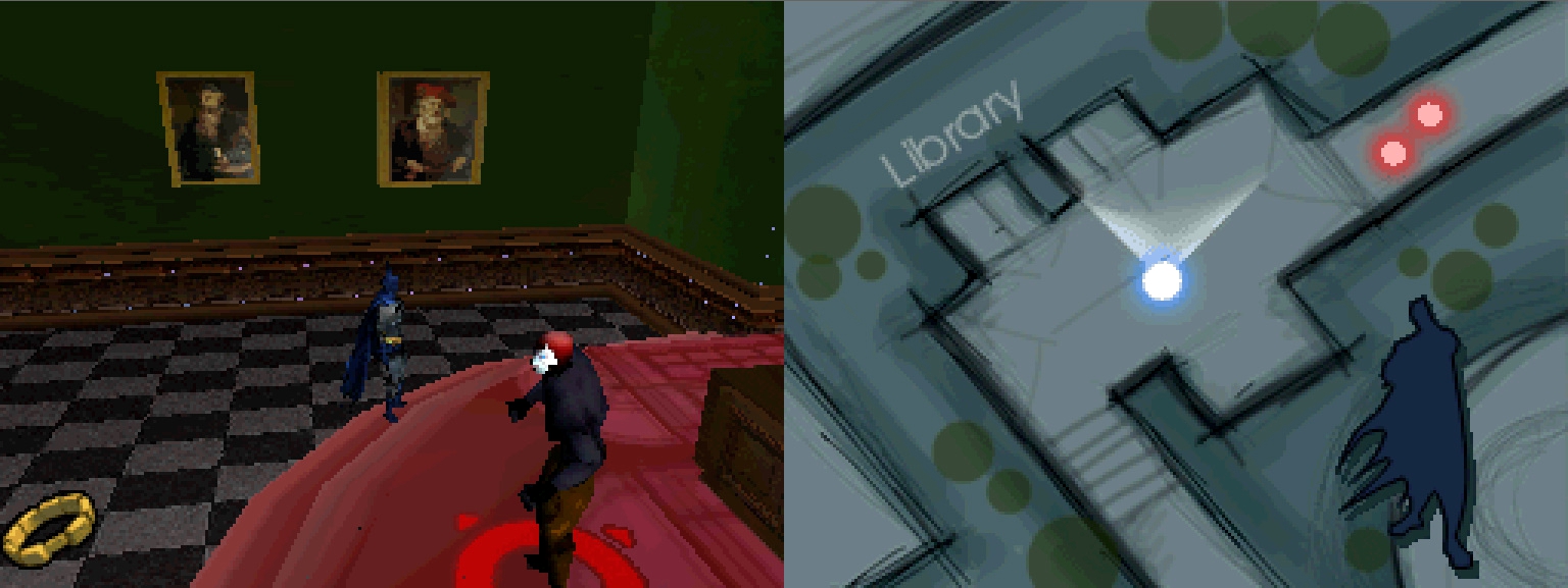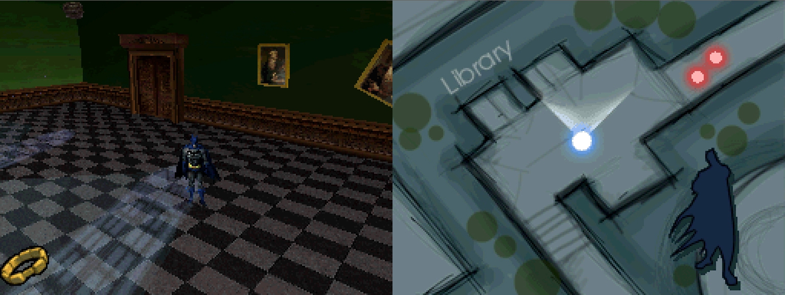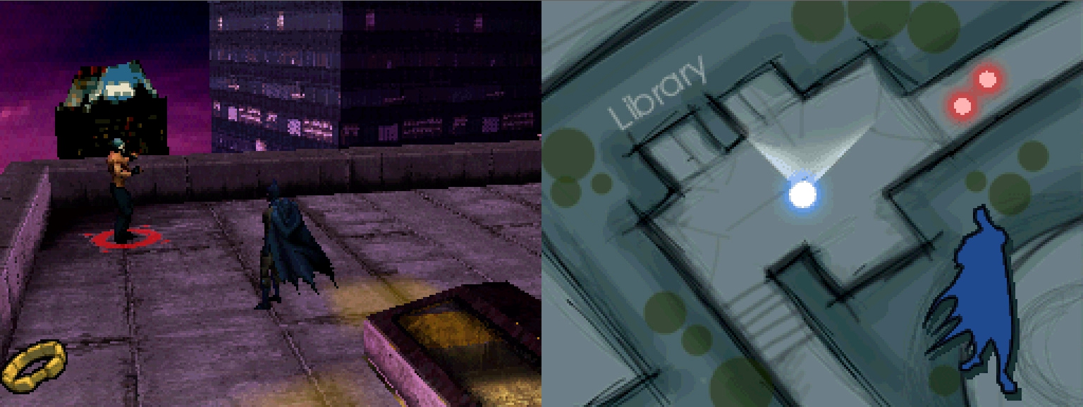 Для пробы доступны два уровня: крыша и библиотека. Мини-карта не работает, это просто картинка. Бэтмен может драться руками и ногами, а также есть отдельная кнопка для бесшумной ходьбы. К сожалению, враги ходить не могут, как и атаковать. Бэтмен умереть не может, хоть и полоса жизни, в виде силуэта героя, опускается до нуля.