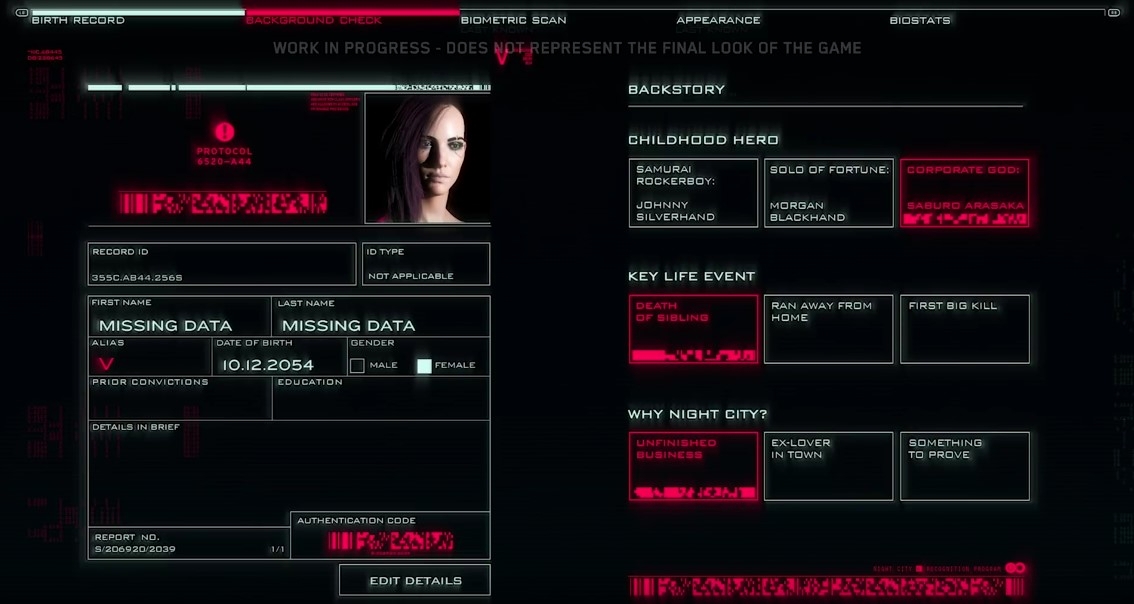 - Один из самых интересных для меня пунктов. Один из главных элементов Cyberpunk 2020 — создание бэкграунда персонажа, перекочевал и в игру. Судя по комментариям разработчиков, эта система напоминает аналогичную из Mass Effect. Допустим, если ты выбрал ключевым моментом в жизни — "убийство брата или сестры", то по ходу игры это сильно повлияет на историю или мотивацию персонажа. Как по мне, такие мелочи и могут сделать Cyberpunk 2077 очень реиграбельной игрой.