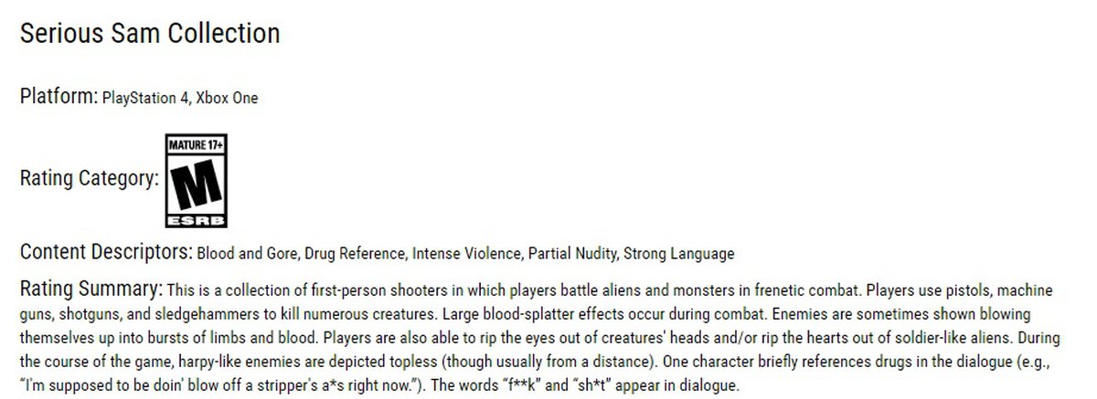 Сборник Serious Sam Collection получил возрастной рейтинг для релиза на PlayStation 4 и Xbox One