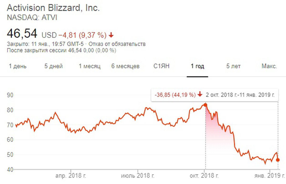 Стоимость акций Activision Blizzard почти непрерывно снижается с октября 2018 года. В ноябре компания опубликовала финансовый отчет, взволновавший инвесторов: холдинг объявил о неудовлетворительных продажах дополнения Destiny 2 Forsaken. После выпуска отчета падение стоимости акций ускорилось.