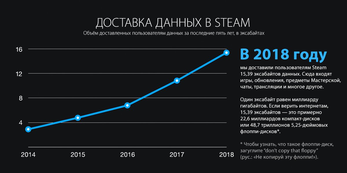 Valve больше трех лет развивает собственную сеть доставки контента: сейчас она объединяет больше 28 тысяч региональных и локальных сетей. С ее помощью можно быстро распространять данные на территории 229 стран. В 2018 году пользователи Steam загрузили свыше 15 экзабайтов данных.
