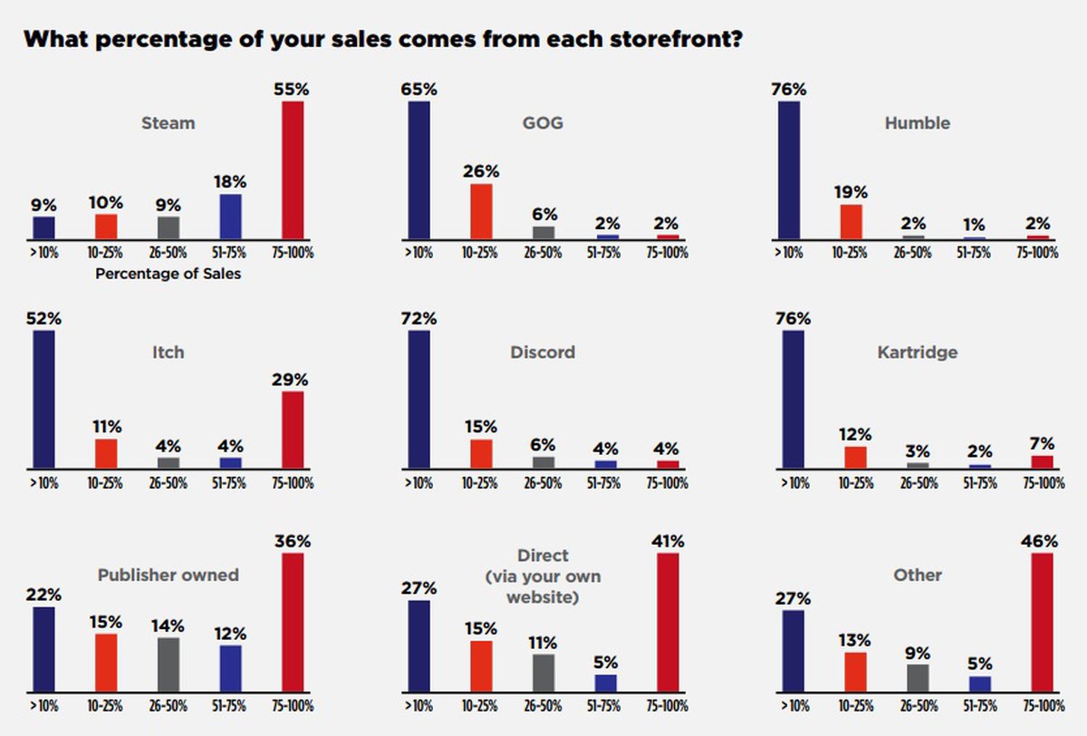 Интересно, что у 55% разработчиков, продающих игры в Steam, эта площадка генерирует самую значительную часть доходов. Остальные популярные площадки в большинстве случаев генерируют незначительную часть выручки.