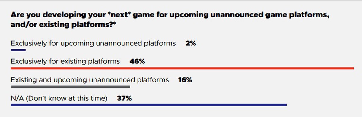 Некоторые компании уже работают над играми для следующего поколения консолей. 2% опрошенных разработчиков трудятся только над эксклюзивами для неанонсированных платформ, 16% участников опроса работают над играми как для существующих, так и для новых платформ.
