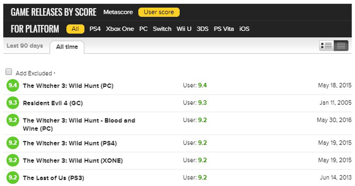 Разработчики из CD Projekt RED обратили внимание на чрезвычайно высокий пользовательский рейтинг The Witcher 3 Wild Hunt в агрегаторе Metacritic. Сейчас оценка PC-версии игры достигает 9.4 баллов из 10: это делает The Witcher 3 самым рейтинговым проектом для PC в истории сервиса.