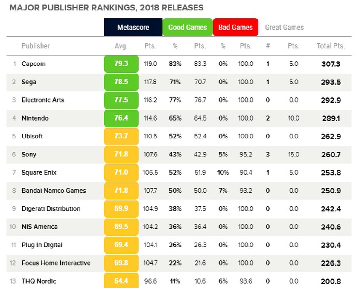 Лучшим крупным издателем 2018 года по версии Metacritic стала компания Capcom: ее проекты в среднем набрали 79.3 балла из 100. Самым высокооцененным релизом Capcom оказался Monster Hunter World (90 баллов из 100), игрой с самым низким рейтингом оказался Mega Man X Legacy Collection 2 (60 баллов из 100).