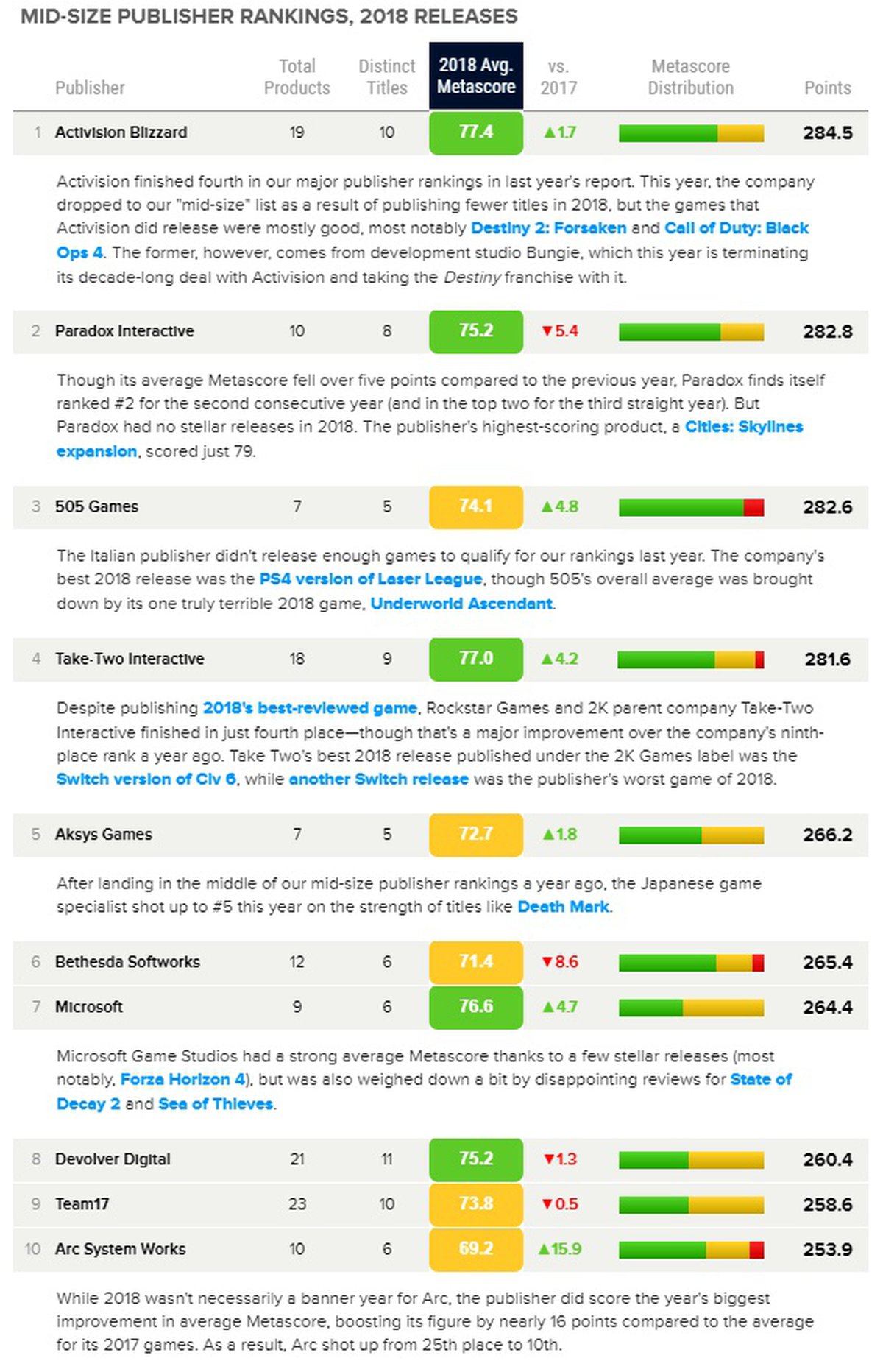 Лидером среди средних издателей стал Activision Blizzard: за год компания выпустила 10 игр, их средний балл составил 77.4 из 100. Второе место у Paradox Interactive (75.2 балла), третье занимает 505 Games (74.1 балла).