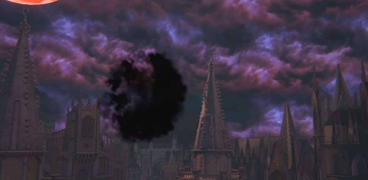 Чтобы создать черное облако, покрывающее кровавую луну, дизайнеры From Software тоже пошли на хитрость. На самом деле облако и луна это два отдельных объекта: на 09:20 видно, что черная сфера появляется гораздо ближе к камере, а эффект луны, накрытой облаком, появляется только из-за удачного выбора ракурса и расстояния.