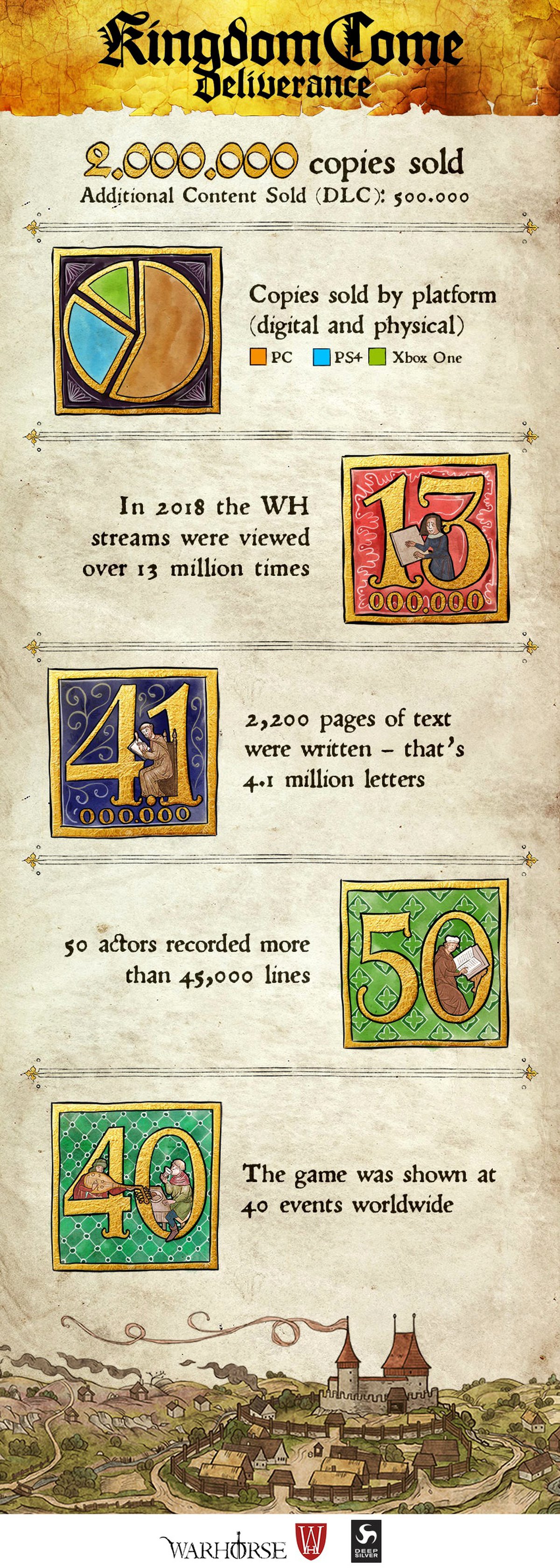 Kingdom Come Deliverance исполнился год — игроки впервые отправились в средневековую Богемию 13 февраля 2018 года. В честь первой годовщины со дня релиза студия Warhorse подготовила инфографику и поделилась интересными фактами о разработке игры.