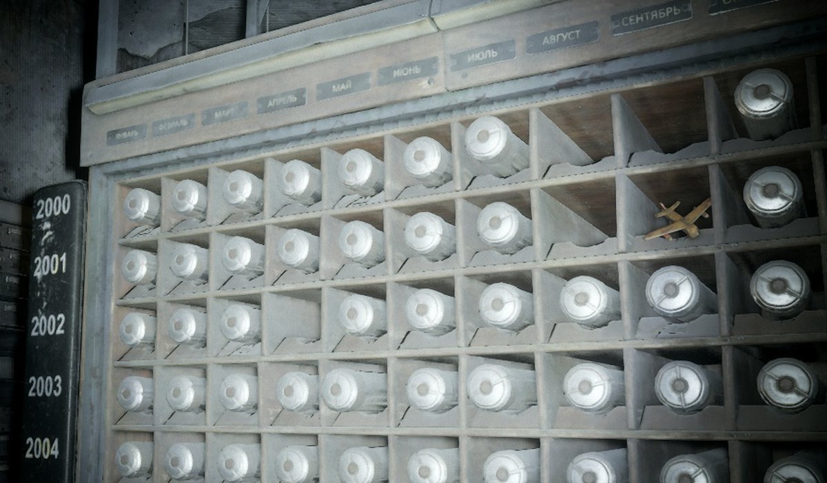 В архиве собраны спутниковые снимки за десятки лет: это большая комната со стеллажами, пронумерованными по годам. Нашему герою нужен стеллаж, начинающийся с 2010 года, но если исследовать предыдущий шкаф, то можно найти любопытную пасхалку.