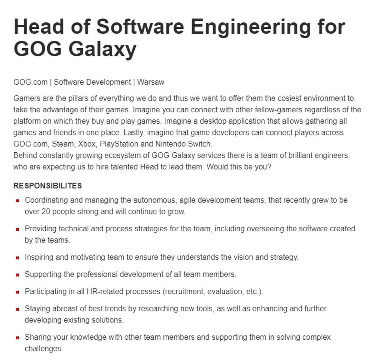 Студия CD Projekt RED может работать над игрой для Nintendo Switch. На это косвенно указывает вакансия, обнаруженная ютубером Doctre81: компании нужен ведущий разработчик в команду клиента GOG Galaxy, «объединяющего игроков в Steam, Xbox, PlayStation и Nintendo Switch».