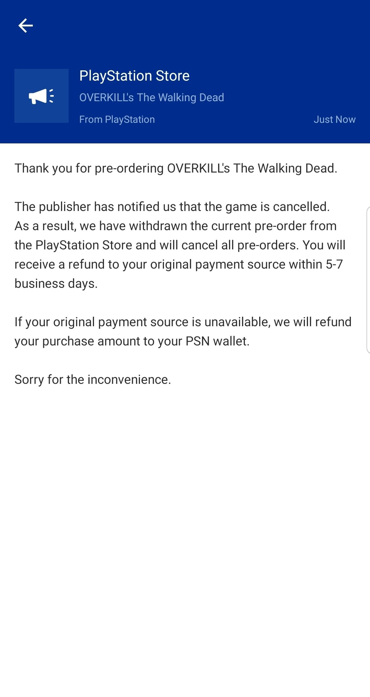 PlayStation Store сообщает, что издатель Overkill’s The Walking Dead отменил консольную версию игры. Теперь магазин отменит все предзаказы и вернет деньги покупателям; игроки получат их в ближайшие 5-7 рабочих дней.