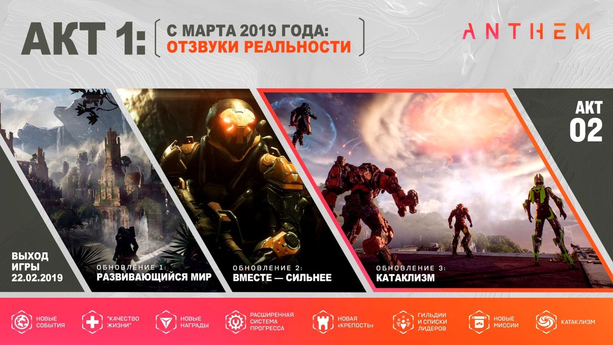 Разработчики Anthem опубликовали подробное расписание поддержки игры на ближайшие месяцы. Мы уже знали, что первый акт состоит из трех обновлений, «Развивающийся мир», «Вместе-сильнее» и «Катаклизм»; они будут выходить ежемесячно, начиная с марта.