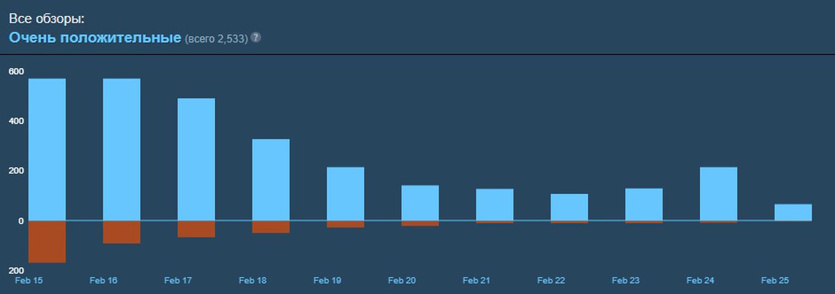 Положительный отзывы — это совсем другое дело. Таких тоже стало меньше, но их количество значительно превосходит число отрицательных обзоров. За тот же день 22 февраля Metro Exodus получил 108 положительных обзоров; в общей сложности у игры больше 2 тысяч положительных отзывов — 85% от общего количества.