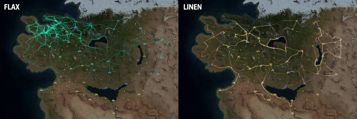 На скриншоте выше показаны два пример тепловых карт. Это карты распространения товаров — на левой показан лен, а на правой ткань. Лен это ресурс, создаваемый в деревнях в северной части Кальрадии; он стоит довольно дешево, поэтому торговцы не стремятся вывозить его далеко: вместо этого лен продают мастерам, создающим ткань.